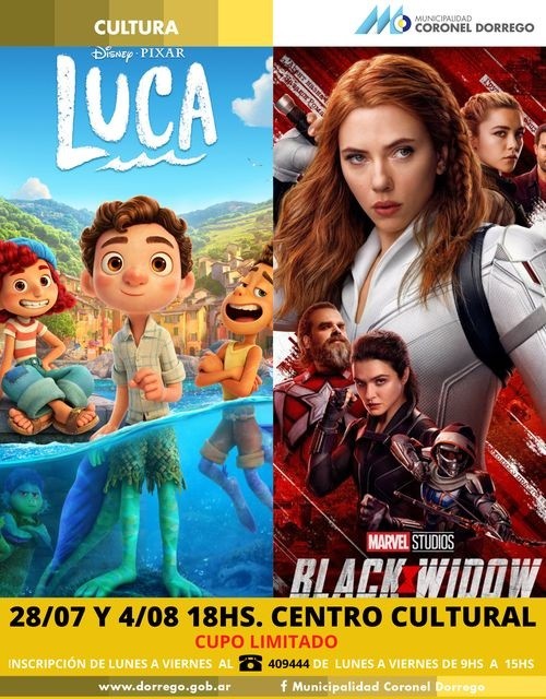 (Coronel Dorrego, 22.Jul.2021 / A1 Noticias)El 28 de este mes y el 4 de agosto, habrá cine con cupo limitado en el Centro Cultural. Se proyectarán las películas Luca y Black X Widow.