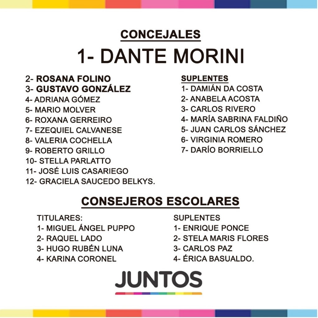 La lista de Juntos del sector que presenta a Facundo Manes es encabezada por el Dr. Dante Morini, a quien acompañan los precandidatos a Concejales: Rosana Folino, Gustavo González, Adriana Gómez y Mario Molver en los primeros lugares