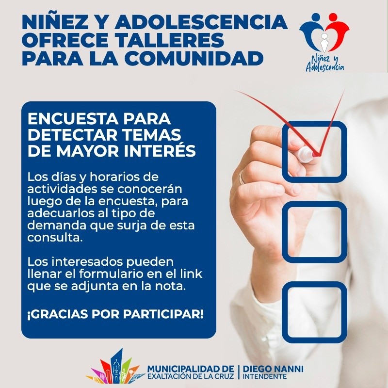 La dirección de Niñez y Adolescencia pondrá en marcha diversos talleres para la comunidad, abordando distintas temáticas propias del área. Para tal fin dicha dirección pone a disposición de los vecinos/as un breve formulario para detectar aquellos temas que despiertan mayor interés