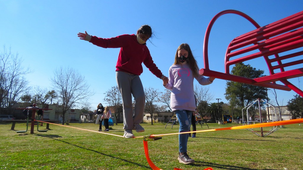 En total fueron 10 jornadas de actividades recreativas, que culminaron con la que tuvo lugar en General Rivas. Allí, el predio frente a la vías de ferrocarril que es utilizado como pista de atletismo fue el escenario para la última tarde de alegría y juegos con los inflables, camas elásticas y los desafíos de los profes de Deportes.