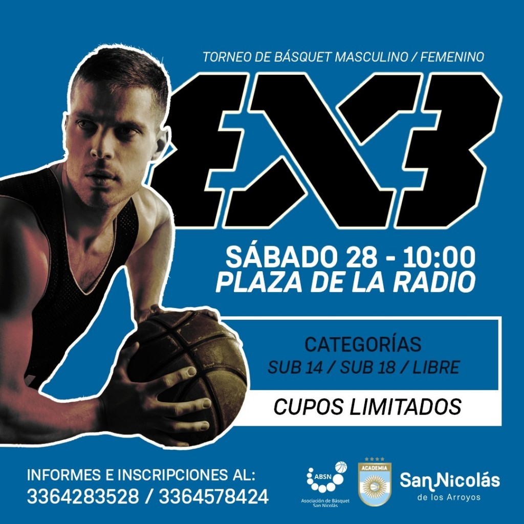 El próximo sábado 28 de agosto desde las 10:00 en la Plaza Belgrano se desarrollará un nuevo torneo masculino y femenino de básquet 3x3. El Torneo se divide en 3 categorías: sub 14, sub 18 y Libre. Durante el evento habrá foodtrucks, espacio de comidas y un lugar recreativo junto a los juegos de la plaza