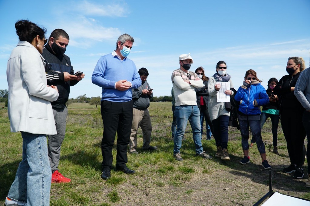 El Intendente José Luis Walser se reunió con los vecinos en la zona donde se ubican los terrenos, acompañado por el Secretario de Obras y Servicios Públicos Claudio Lara, el director de Legal y Técnica Daniel Kolankowsky, la coordinadora de Hábitat y Vivienda Carolina Lema y el Director de Automatización y Electrotecnia Pedro Rotundo.
