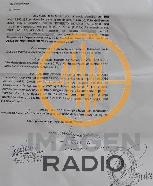 Durante las entrevistas, agregó detalles de la alquimia financiera de la campaña del 2015, ofreciendo nombres y lugares donde se habrían llevado a cabo las irregularidades. En la presentación judicial, Marasco relata que "por versiones periodísticas en el mes de julio de 2018 me entero que existen problemas con los aportes de campaña del 2015 en mi partido Cambiemos" y aclara que si bien figura en los listados oficiales aportando $50.000, ´jamás hice ese aporte de dinero, ni ningún otro para la campaña, ni para el partido´", agregando que también "figuran todos los demás componentes de la lista aportando dinero, y no me consta que lo hayan hecho".