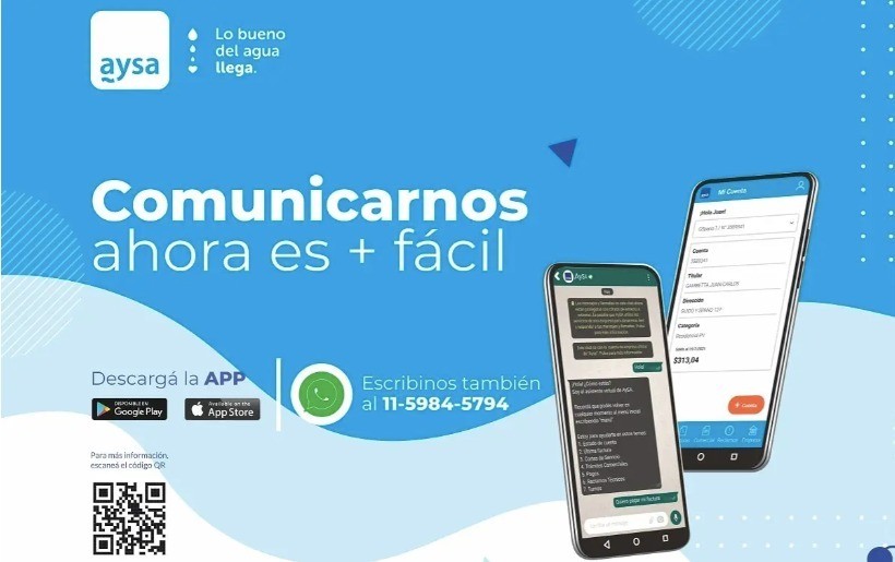 Con el objetivo de fortalecer la relación con sus usuarios, la empresa Agua y Saneamientos Argentinos (AySA) puso a disposición dos nuevos canales de atención al público. Con atención automatizada a través de WhatsApp y una aplicación propia para dispositivos móviles, se podrá acceder a facturas, consulta de saldos y gestionar todo tipo de consultas