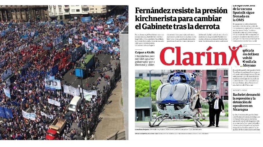 El diario del lunes es preocupante, las tapas de Clarín y La Nación comenzaron el operativo desestabilizador con la publicación de una foto donde se los ve al presidente de la Nación, Alberto Fernández al lado de un helicóptero, intentando recordar un triste periodo de la Argentina, cuando un perdido “Chupete” De la Rúa se fue volando de la Casa Rosada y nuestro país estuvo al borde de una guerra civil. Del “Que se vayan todos”, al “Aquí mandamos nosotros”. La respuesta solo la tiene la política, tenemos dos meses para encontrar el rumbo.