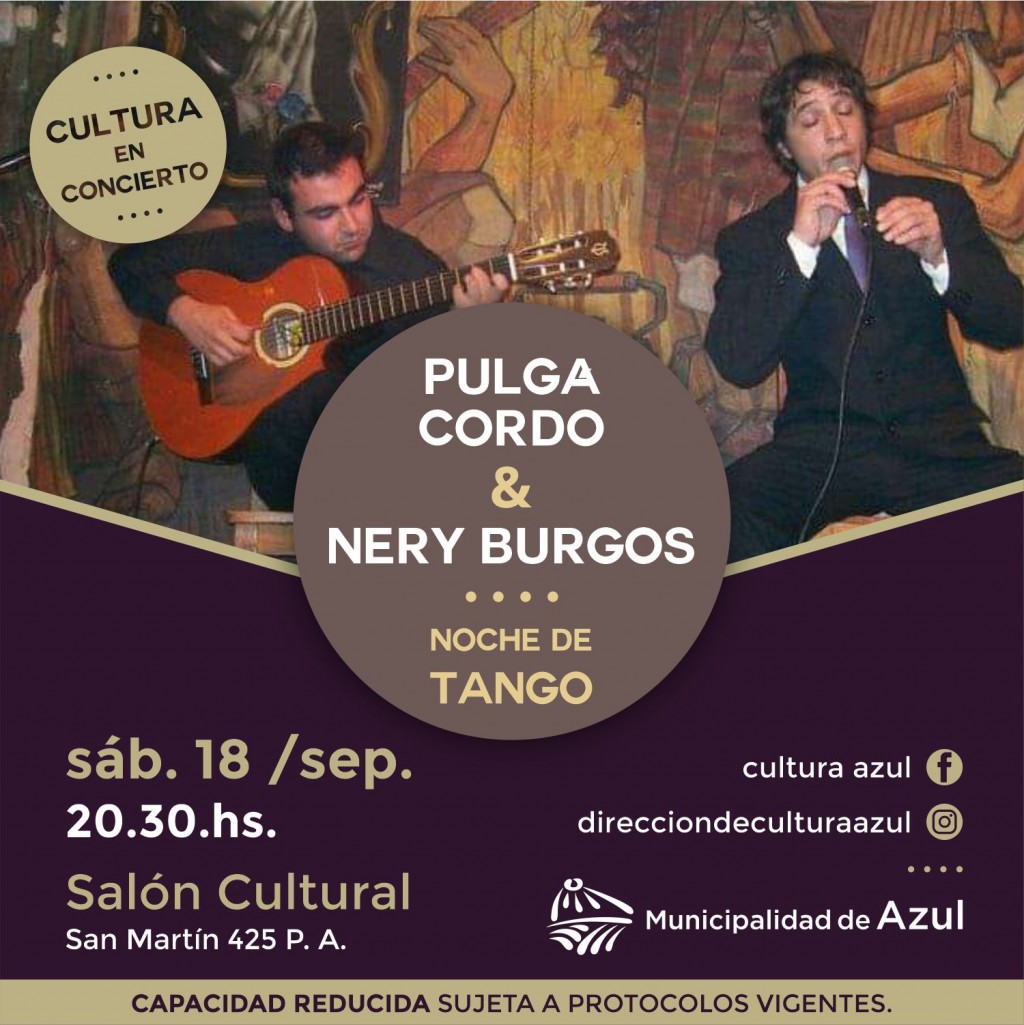 La Municipalidad de Azul informa que este sábado, a partir de las 20.30, en el Salón Cultural –San Martín 425 PA- se exhibirá en el marco del ciclo “Cultura en Concierto”, el dúo integrado por Emmanuel “Pulga” Cordó (voz) y Nery Burgos (guitarra)