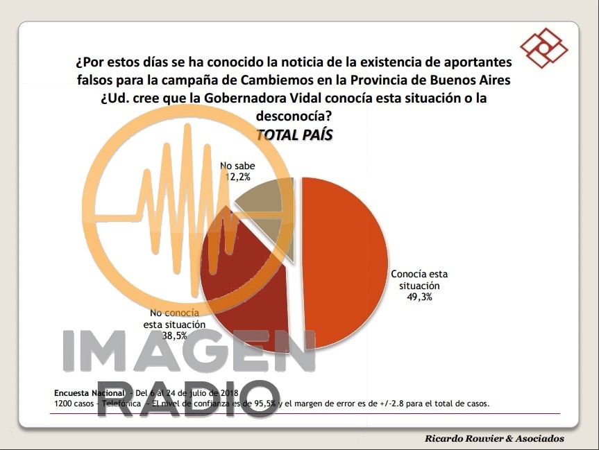 (CABA, 31.Jul.2018 / A1 Noticias) Cuando trascurrió más de un mes de conocerse públicamente el listado de aportes de campaña en Cambiemos, un estudio de la consultora Ricardo Rouvier y Asociados arrojó que el 49,3% de los argentinos cree que la gobernadora María Eugenia Vidal sabía que hubo “aportantes falsos” en las campañas bonaerenses de 2015 y 2017.