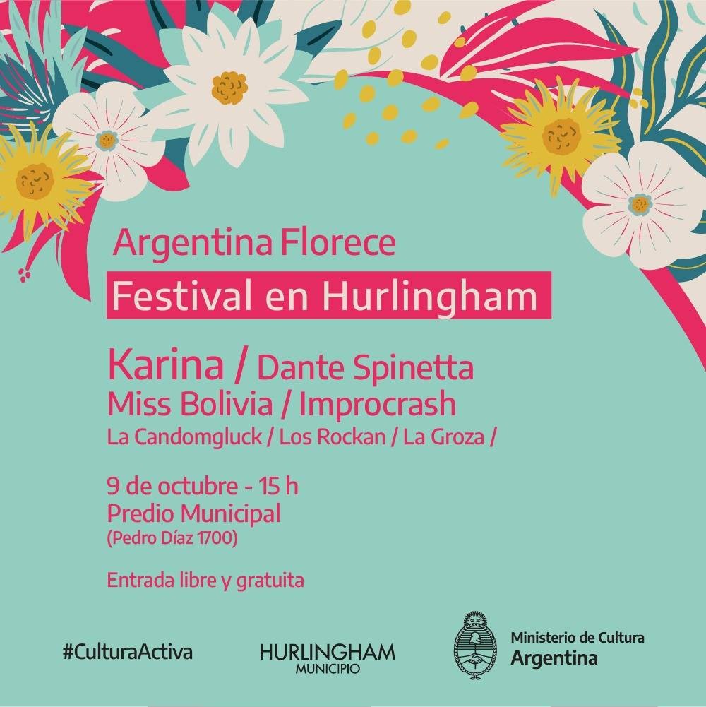 (Hurlingham, 07.Oct.2021 / A1 Noticias) El próximo sábado 9 de octubre desde las 15 hs. se realizará en Hurlingham el festival musical “Argentina Florece”, organizado por el municipio y por el Ministerio de Cultura de la Nación, que contará con las presentaciones de la cantautora y compositora Karina, el músico Dante Spinetta y la cantante Miss Bolivia. También se presentarán la banda de percusión hurlinghense La Candomgluck, la agrupación de clown y música Los Rockan y la banda de cuarteto La Groza.