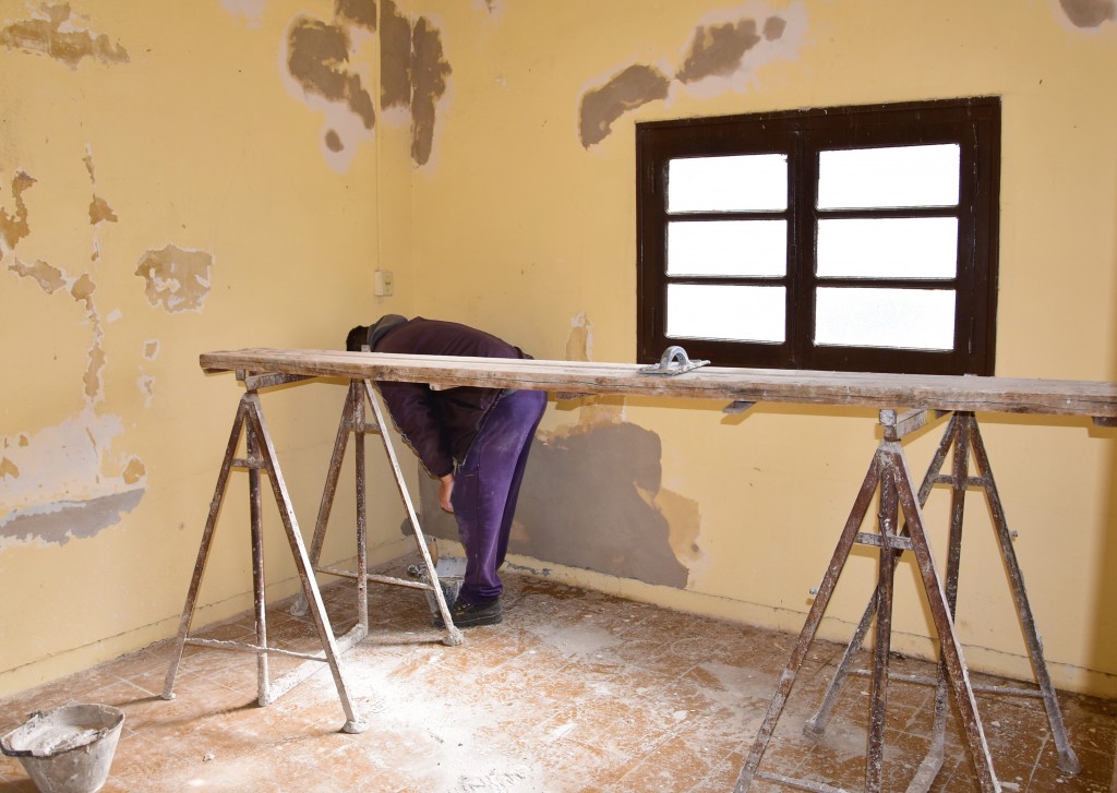 (Tres Lomas 07.Oct.2021 / A1 Noticias) Los operarios encargados de la obra, se encuentran refaccionando el ingreso al lugar, le depósito y la capilla, con trabajos en paredes y cielo raso.