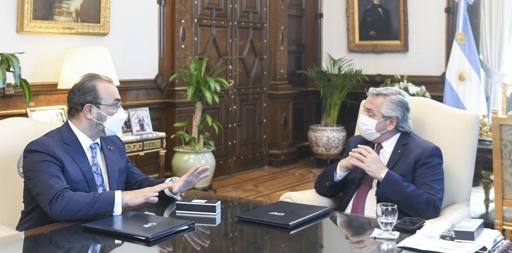 El presidente Alberto Fernández mantuvo en la Casa Rosada un almuerzo de trabajo con el presidente ejecutivo de CAF (Banco de Desarrollo de América Latina), Sergio Díaz-Granados, con quien analizó los ocho créditos por más de 1.100 millones de dólares que se suscribieron hoy. Además, acordaron nuevo financiamiento para impulsar el desarrollo integral del país por 570 millones de dólares en lo que resta de 2021, y por 1.000 millones de dólares adicionales en 2022