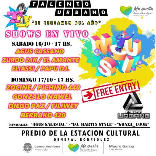 (General Rodríguez, 14.Oct.2021 / A1 Noticias)  Con una gran puesta escénica y shows en vivo a cargo de reconocidos artistas de la música urbana, la actividad se desarrollará durante los días sábado 16 y domingo 17 de octubre en el Predio Estación Cultural (Av. 25 de Mayo e Int. Manny), desde las 17 hs.