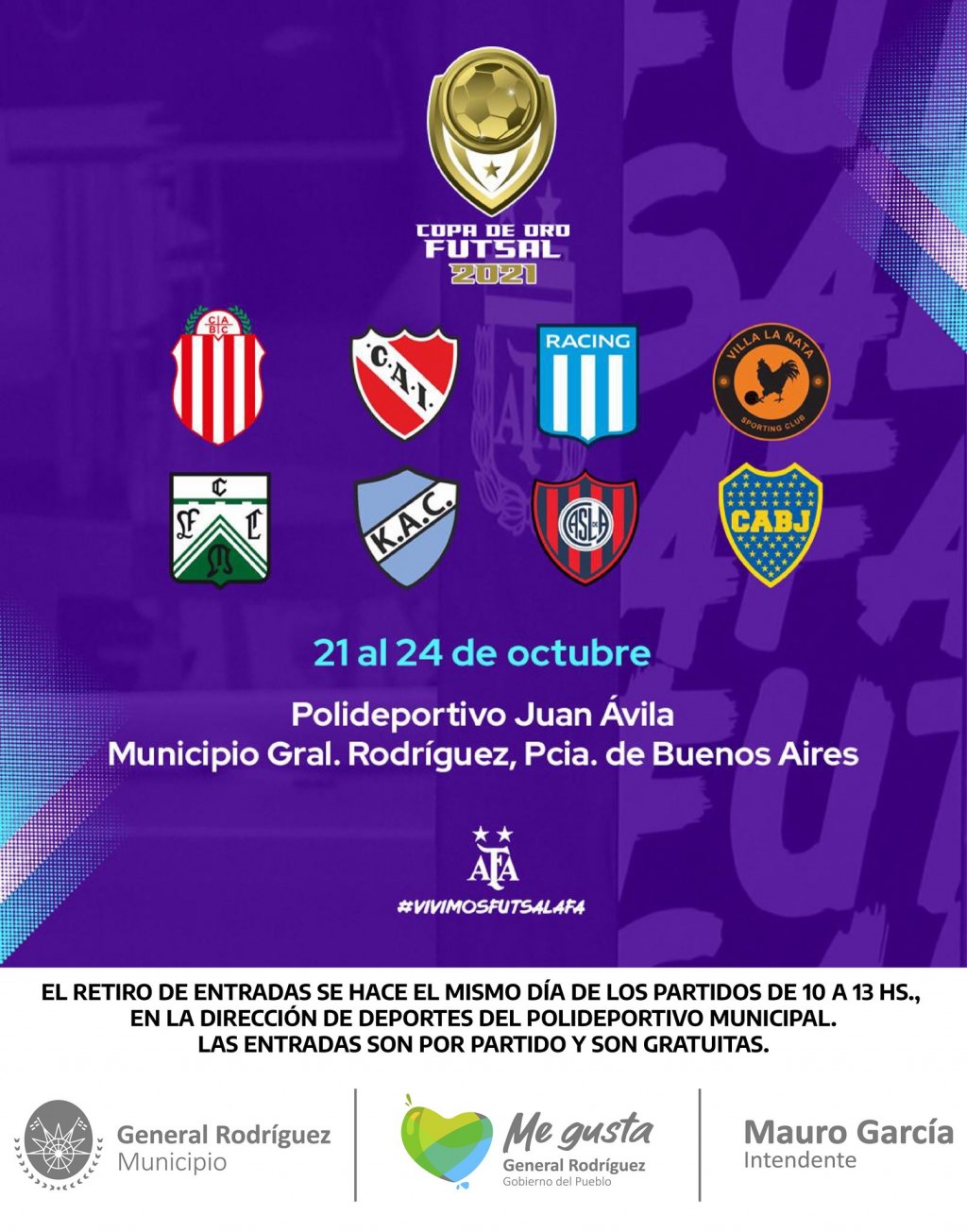 Desde el jueves 21 al domingo 24 de octubre se disputará la Copa de Oro de Futsal AFA, con la participación de los ocho mejores equipos de la Liga de Primera División que competirán en un torneo a desarrollarse en el Microestadio municipal de General Rodríguez