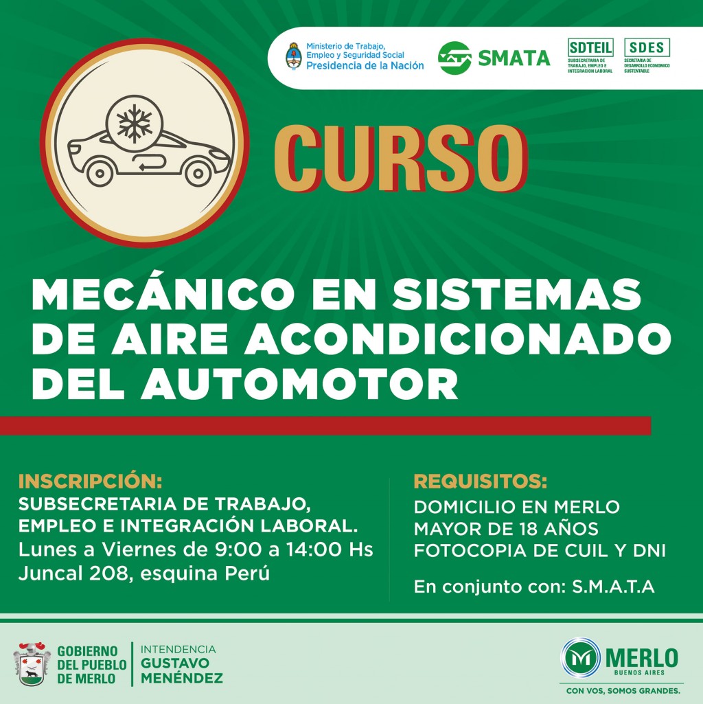 Se encuentra abierta la inscripción al curso que la Municipalidad de Merlo brinda en convenio con SMATA: Mecánico en Sistemas de Aire Acondicionado del Automotor. Está dirigido a vecinos y vecinas del distrito mayores de 18 años
