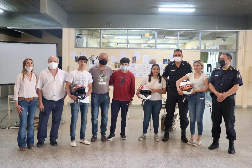 Se llevó adelante una charla de seguridad vial en el Escuela Educación Secundaria Media N°2 sobre la importancia del uso del casco y tener licencia y seguros. También se hicieron sorteos de cascos y licencias