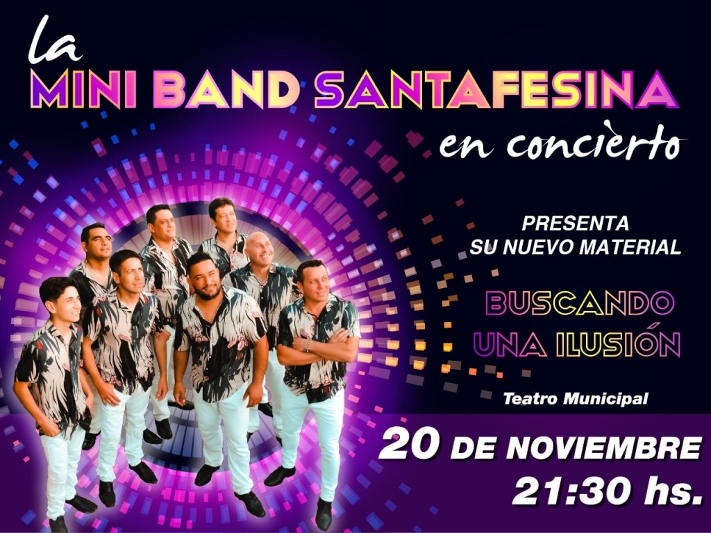 “La Mini Band Santafesina” se presentará el sábado 20 de noviembre a las 21:30 en el Teatro Municipal donde presentará las canciones de su nuevo disco. Este grupo nicoleño de cumbia santafesina se formó hace siete años. En 2017 se consagró como revelación de la Fiesta Nacional de la cumbia santafesina en Santa Fe.
