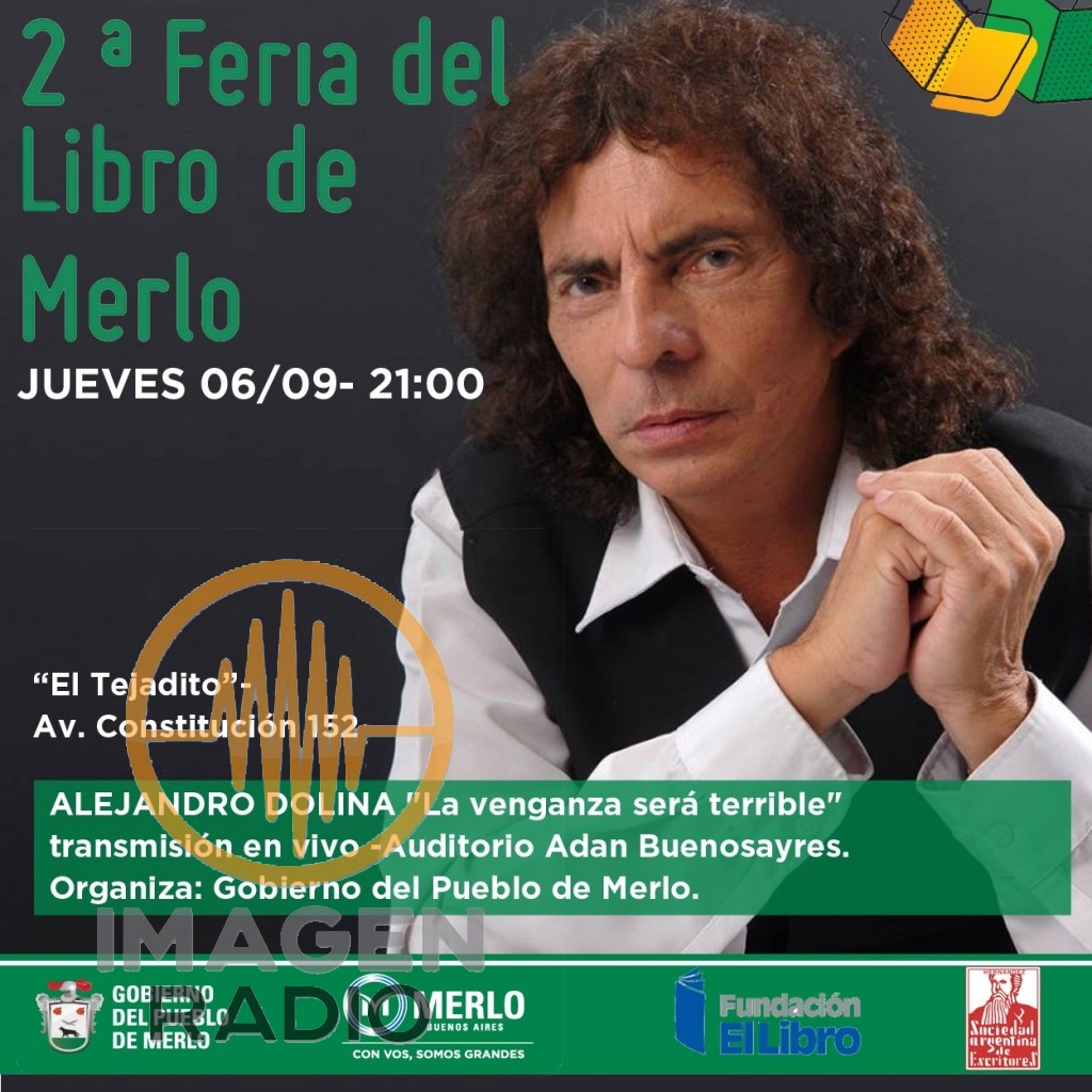 (Merlo, 04.Sep.2018 / A1 Noticias) El acto de inauguración de la Segunda Feria del Libro de Merlo se llevará a cabo el jueves 6 de septiembre y el cierre de la jornada contará con la presencia de Alejandro Dolina, quien realizará su tradicional programa de radio “La Venganza será Terrible”, desde el salón auditorio Adán Buenosayres, del Predio El Tejadito, ubicado en la Av. Constitución 152.