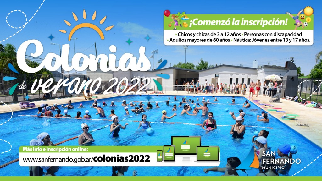 Comenzó la inscripción digital en www.sanfernando.gob.ar/Colonias2022 o presencial en los Polideportivos municipales. Podrán anotarse chicas y chicos de 3 a 12 años, adultos mayores de 60, personas con discapacidad y jóvenes de entre 13 y 17 años de la Colonia Náutica. Del 3 de enero al 18 de febrero, San Fernando tendrá la mejor temporada de piletas y actividades al aire libre