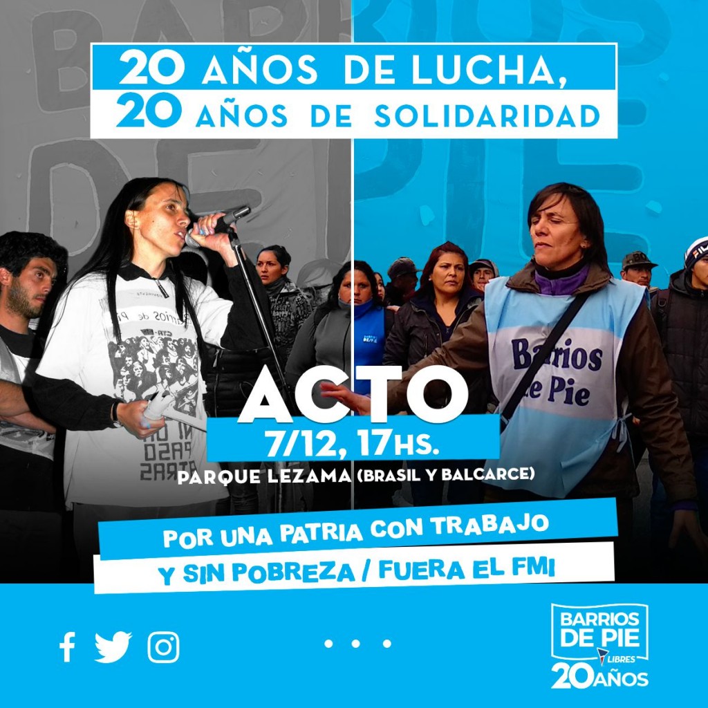 (CABA, 06.Dic.2021 / A1 Noticias) Barrios de Pie, fundada en el seno de la entonces Corriente Patria Libre, hoy Libres del Sur, realizará un acto presencial con sus principales figuras y representantes de todas las provincias. Esta vez, la consigna es “Por una Patria con trabajo y sin pobreza, fuera el FMI”.