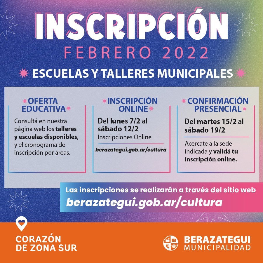 La Municipalidad de Berazategui informa que en el transcurso de la próxima semana permanecerá abierta la inscripción para los talleres y las diferentes Escuelas municipales de la Secretaría de Cultura y Educación