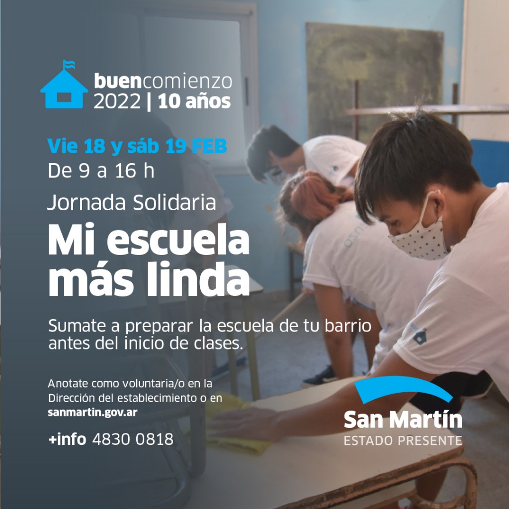 (San Martín, 15.Feb.2022) A 10 años del lanzamiento del programa Buen Comienzo, el Municipio de San Martín vuelve a convocar a vecinas y vecinos a sumarse a las jornadas solidarias del próximo viernes 18 y sábado 19 de febrero, para dejar las escuelas en mejores condiciones antes del comienzo de clases.