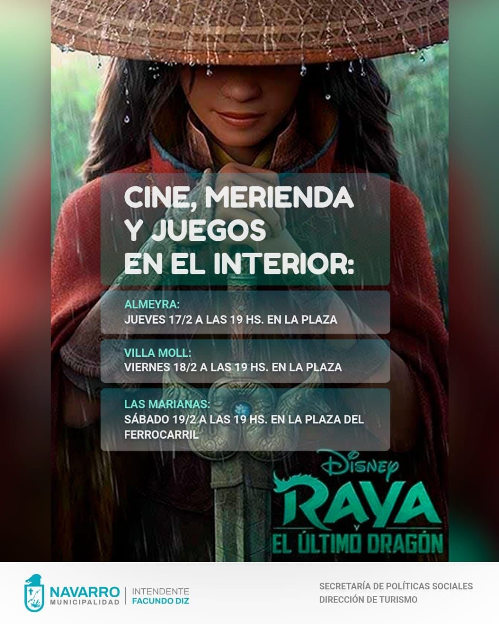 Este jueves a las 19 horas, en la plaza de J.J Almeyra, comienza el ciclo de actividades recreativas que llevará cine a cielo abierto. Se proyectará la película de Disney, Raya y el Último Dragón