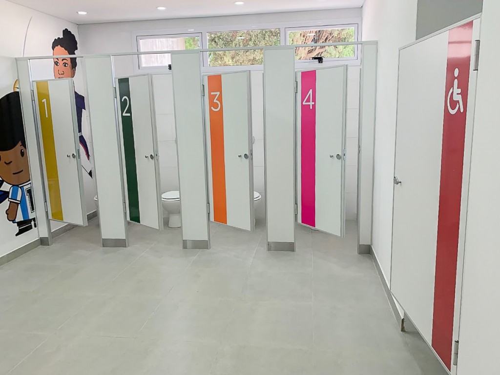 La obra finalizada en la Escuela Primaria Nº1 consiste en la construcción de dos módulos de baños que incluyen sanitarios para personas con discapacidad. Los baños están equipados con insumos de jabón y alcohol para garantizar el cuidado de la salud de los niños y las niñas que asisten a la escuela.