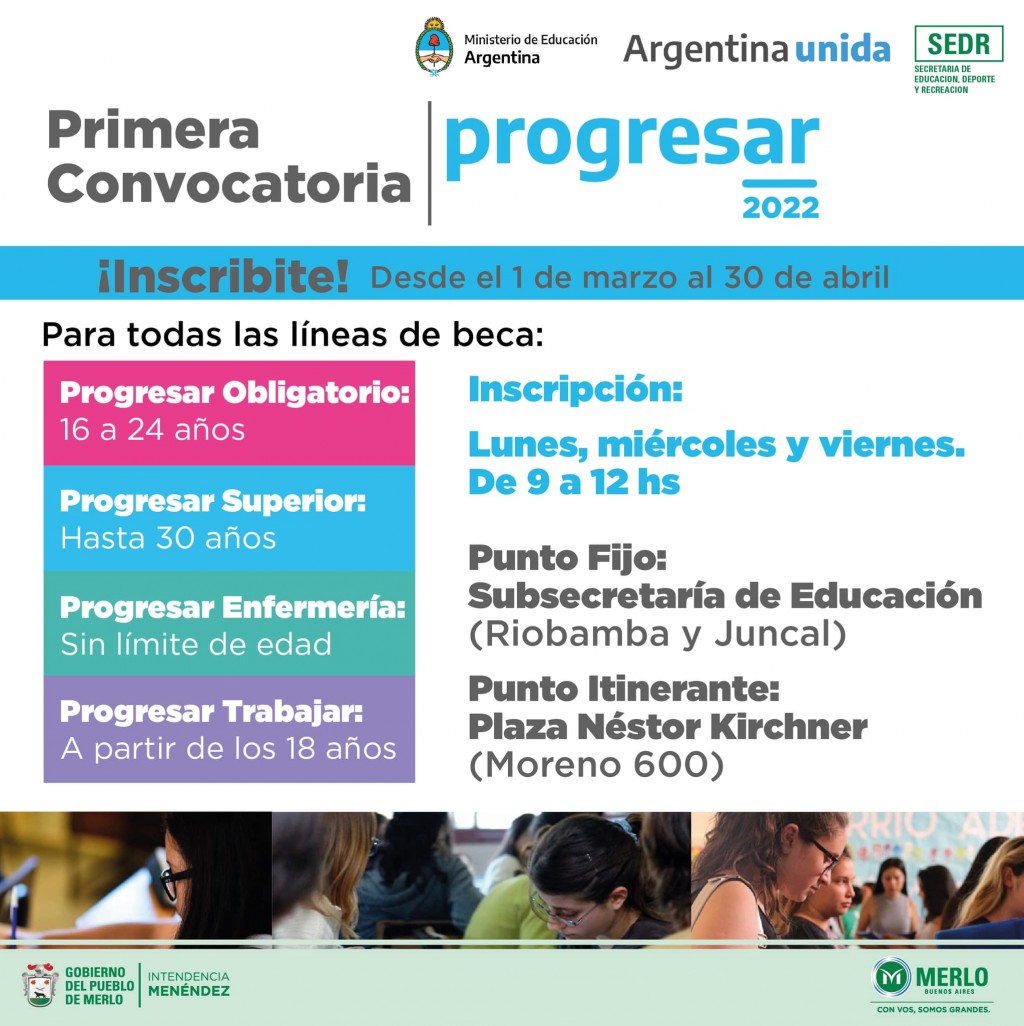 La Subsecretaría de Educación de Merlo informó sobre la apertura de las primeras inscripciones para las becas Progresar del 2022. Las mismas se realizarán desde el 1º de marzo al 30 de abril