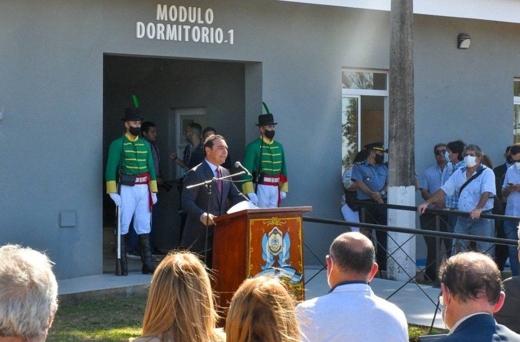 (Corrientes, 08.Mar.2022) El gobernador Gustavo Valdés encabezó este lunes el acto de inauguración de la primera etapa de obras del Centro de Formación y Capacitación Policial, en el barrio Santa Catalina. Dicho Complejo se encuentra integrado por el departamento de la Escuela Superior “Coronel Genaro Berón de Astrada”, la división de Escuela de Policía “General José de San Martín”, división de Escuela de Suboficiales “Sargento Juan Bautista Cabral” y Academia Policial.