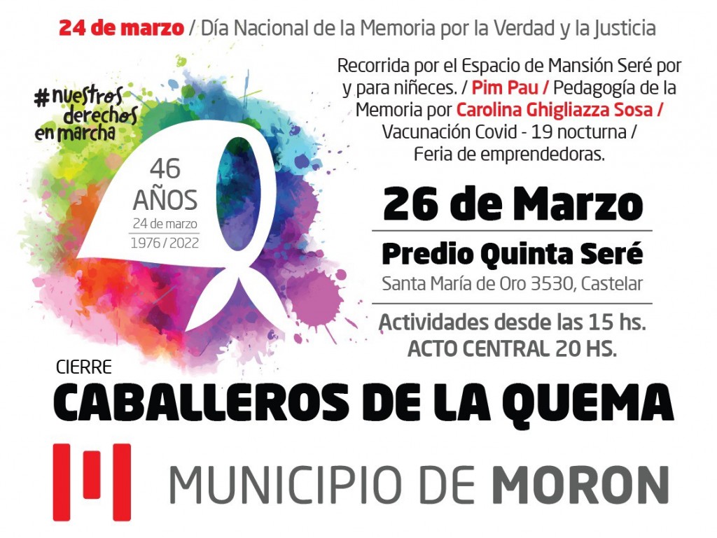 Las actividades continuarán el sábado 26 de marzo, desde las 15, donde habrá actividades artísticas y de organismos de Derechos Humanos, para ejercitar la memoria por la Verdad y la Justicia. Se presentarán distintos espectáculos musicales, con el cierre a cargo de los Caballeros de la Quema. También habrá shows de Zoe Gotusso, Pim Pau y Parkour en el Geriátrico. Todas las actividades son de acceso libre y gratuito, en el Predio Quinta Seré, ubicado en Santa María de Oro 3530 esquina Blas Parera, Castelar, partido de Morón.