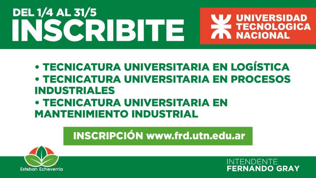 El Municipio de Esteban Echeverría convoca a las vecinas y a los vecinos a sumarse a las carreras terciarias que ofrece la Universidad Tecnológica Nacional (UTN) en su sede local. La inscripción se inicia hoy, 1 de abril, y se extiende hasta el 31 de mayo