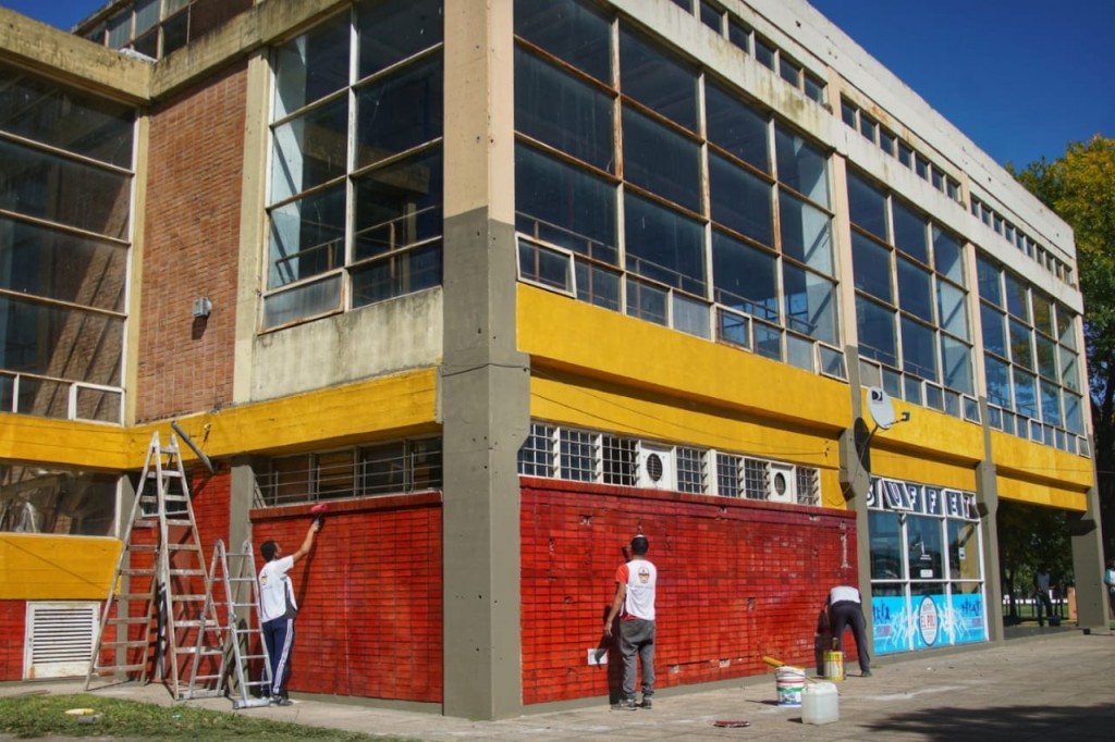 Tras la realización de trabajos de reconstrucción y pintura de los muros perimetrales, actualmente se avanza con la puesta en valor de la fachada del gimnasio cubierto con tareas de limpieza de grafitis y pintura, que culminarán con la instalación de iluminación artística con tecnología LED.