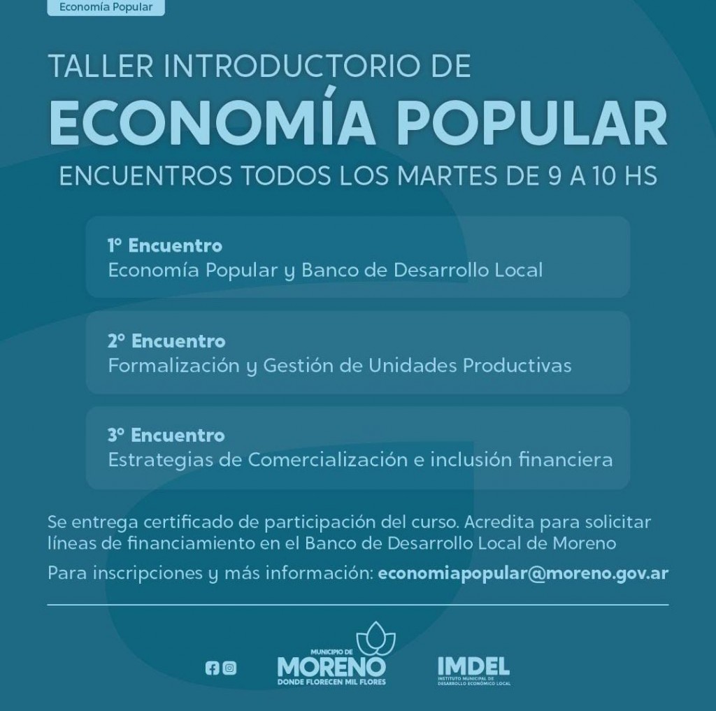 El Instituto Municipal de Desarrollo Económico Local (IMDEL) de Moreno, a través de la Coordinación de Economía Popular, continúa brindando todos los martes de 9 a 10 horas, el ciclo de talleres para capacitar a las vecinas y vecinos que así lo quieran en la economía popular
