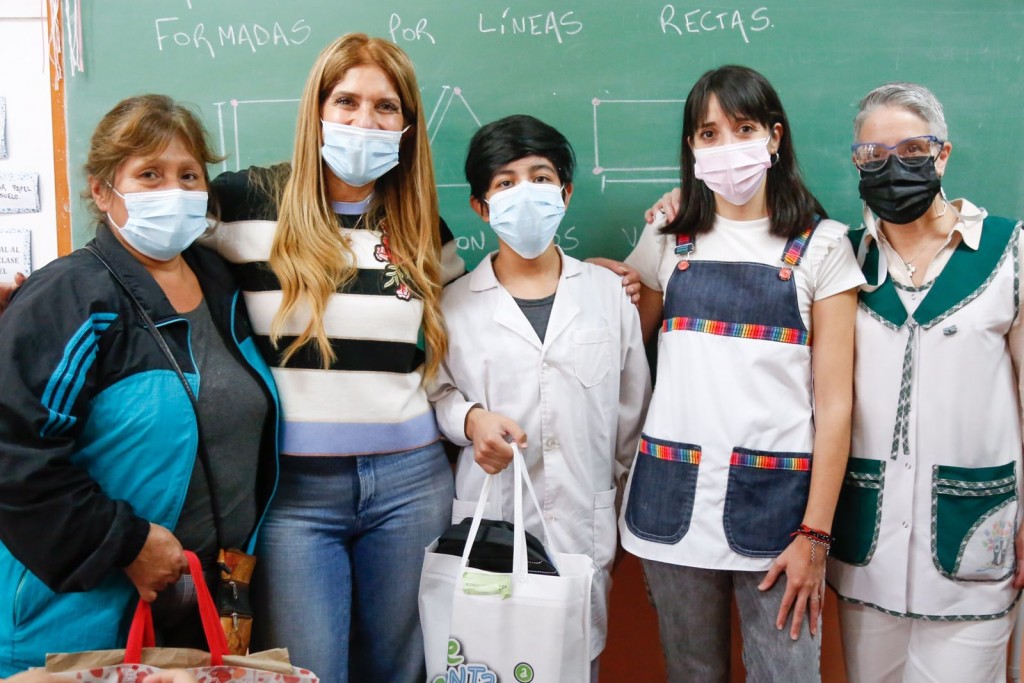 (Avellaneda, 11.Abr.2022 / A1 Noticias) Acompañada por la directora Maricel Orlando, la jefa de Gabinete pasó por las aulas y entregó un total de 55 kits compuestos en cada caso por una mochila, un guardapolvo y un par de zapatillas.