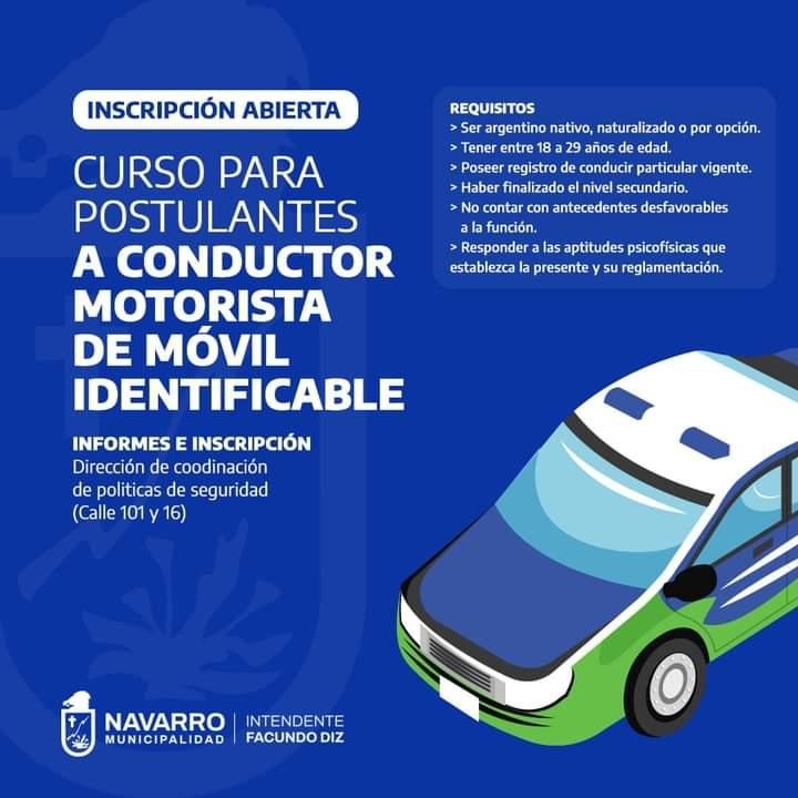 La Municipalidad de Navarro convoca a quienes deseen trabajar como conductores motoristas de la Policía Comunal a inscribirse en la sede de la dirección de Coordinación de Políticas de Seguridad que funciona en calle 101 y 16 en el horario de 7 a 13.30 horas
