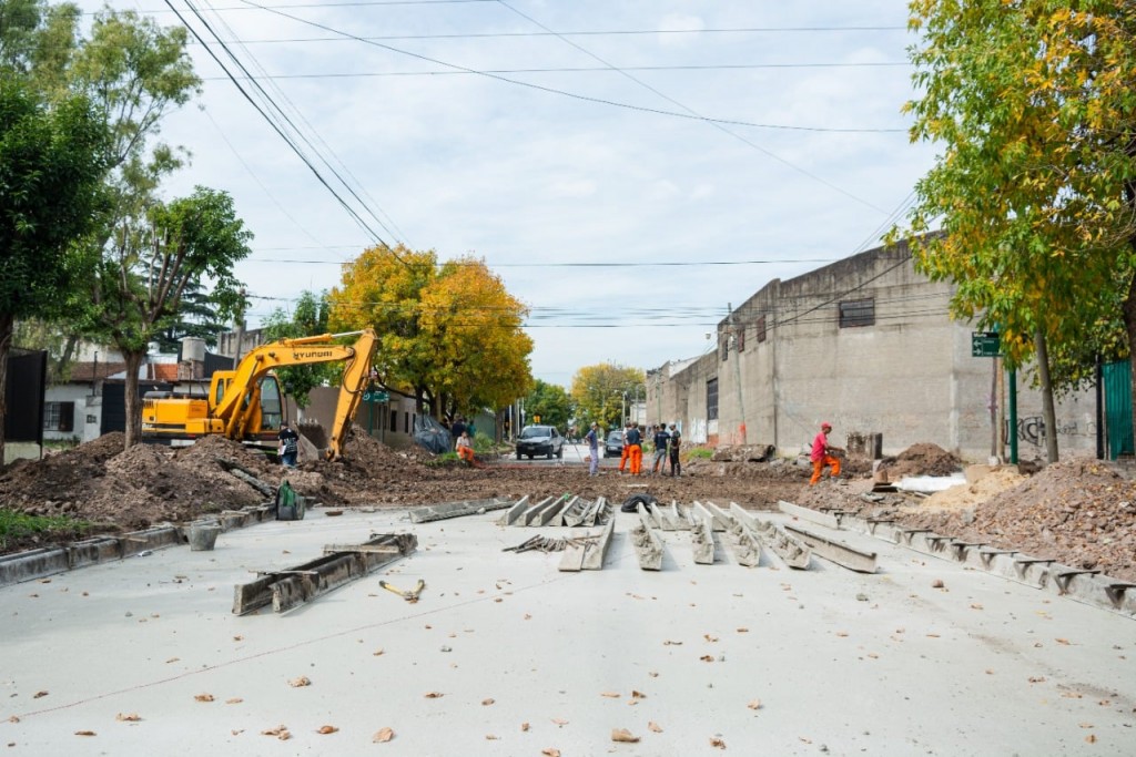 La Secretaría de Obras y Servicios Públicos realiza trabajos de pavimentación en calle Junín entre Cervantes y Ruta 40. El área municipal comenzó con la apertura para la construcción de bocacalle de hormigón en calles Junín y Ombú