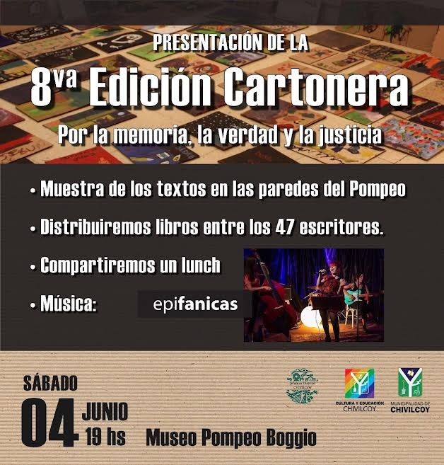 Los coordinadores de Cultura, María del Carmen Ruggirello y Daniel Guala, invitaron a la comunidad a participar de la presentación de la 8° Edición Cartonera por la Memoria, la Verdad y la Justicia, que se llevará a cabo este sábado a partir de las 19 horas en el Museo Pompeo Boggio