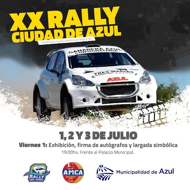 Organizado por la Municipalidad de Azul y el Auto Moto Club Azul se llevará acabó el XX Rally Ciudad de Azul, Categoría Mar y Sierras en homenaje a Guillermo Quattrocchio los días viernes 1, sábado 2 y domingo 3 con diversas actividades