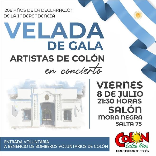 (Colón (ER), 05.Jul.2022 / A1 Noticias)   La Municipalidad de Colón invita a toda la Comunidad a participar, colaborar, compartir y acompañar la Velada de Gala que se desarrollará el próximo viernes 8 de julio a las 21.30 horas en el Salón Mora Negra, con entrada a voluntad, a beneficio de los Bomberos Voluntarios de nuestra Ciudad.
