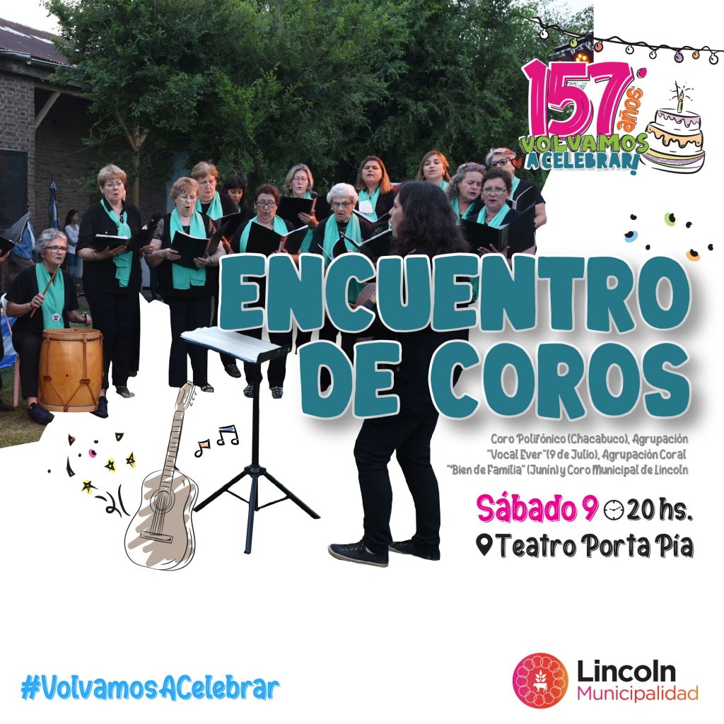 En el marco de las actividades programadas en el "mes aniversario" del Partido de Lincoln, este sábado, 9 de julio, se realizará un encuentro de coros con la participación de agrupaciones locales y regionales. El evento tendrá lugar en el Teatro Porta Pía desde las 20 horas