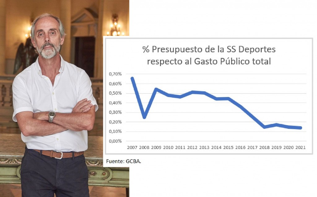 “Hay datos muy concretos. La evolución de los presupuestos durante los gobiernos de Macri y Larreta demuestran, como se observa en el gráfico a continuación, que el interés por acompañar el desarrollo de la actividad deportiva en la ciudad ha ido en franco retroceso en estos 15 años que gobiernan la ciudad. El gasto destinado a la Subsecretaría de Deportes en la Ciudad de Buenos Aires, entre los años 2007 y 2021, creció cincuenta veces menos que el total del gasto público”, señaló.