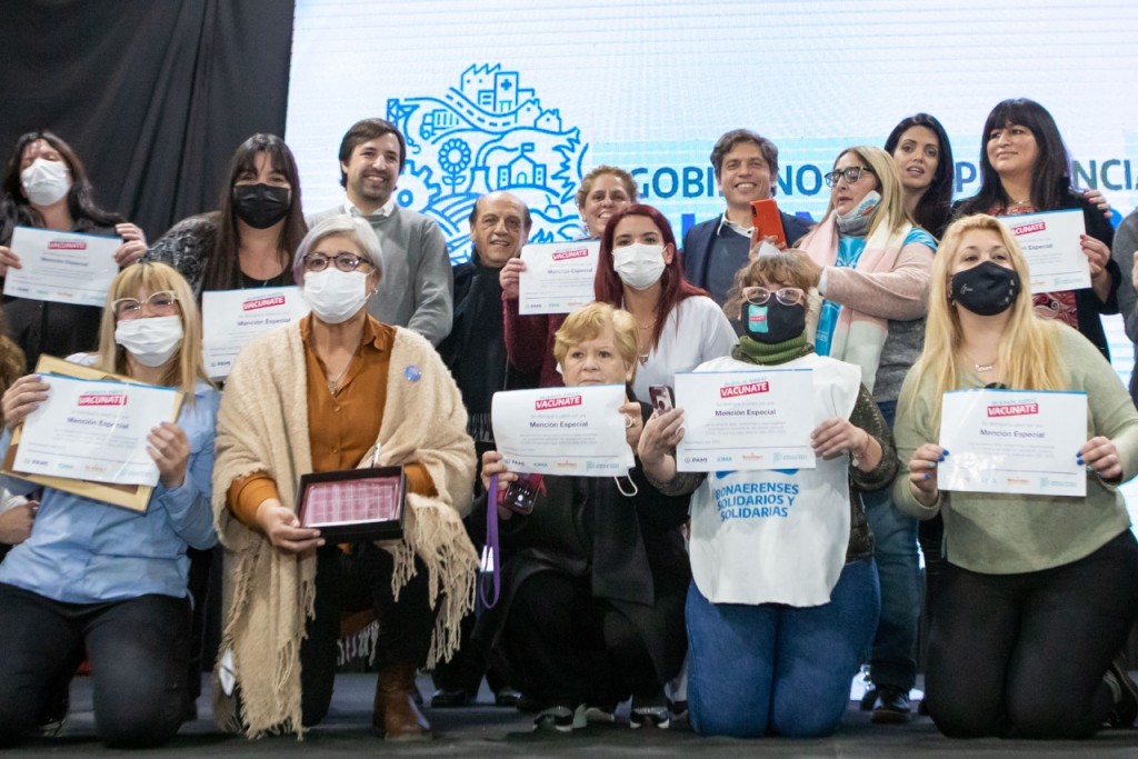 Se realizó un reconocimiento a trabajadores, trabajadoras y voluntarios de las postas de vacunación contra el COVID-19 de Berazategui, por parte del gobernador de la provincia de Buenos Aires, Axel Kicillof; y el intendente Juan José Mussi. La actividad, organizada por el PAMI en el Centro de Actividades Roberto De Vicenzo, también contó con la presencia del ministro de Salud bonaerense, Nicolás Kreplak, y la directora ejecutiva del PAMI, Luana Volnovich