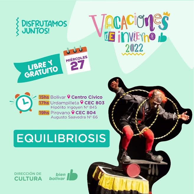 El miércoles 27 a las 15hs, en el Centro Cívico, se presentará el espectáculo infantil “Equilibriosis”. El mismo show estará en Urdampilleta a las 17hs y en Pirovano a las 19hs.