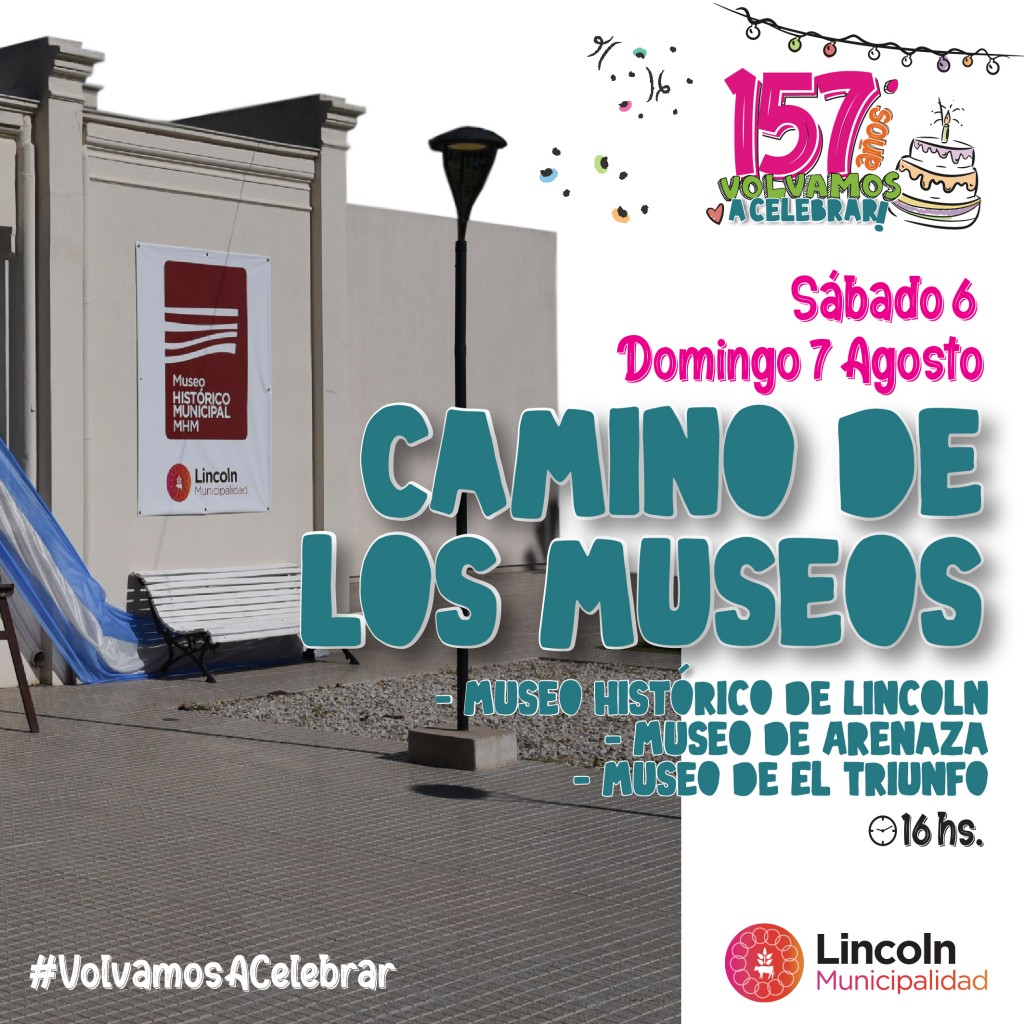 Cabe señalar la jornada de museos programa para el día domingo 7 a desarrollarse en las localidades de El Triunfo y Arenaza contará con traslado desde la Municipalidad de Lincoln con salida a las 15 horas. Quienes deseen sumarse deben inscribirse podrán hacerlo escribiendo un mail a: [email protected]