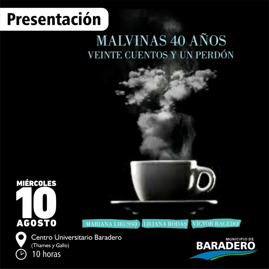 El miércoles 10 de agosto en el Centro Universitario Baradero (Thames y Gallo) a las 10 horas, se realizará la presentación del libro “Malvinas 40 años: veinte cuentos y un perdón”