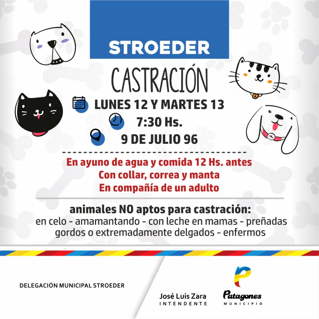 La Delegación Municipal de Stroeder informa a la comunidad que los días 12 y 13 de septiembre se realizará un operativo de castración de animales hasta los 6 años de edad