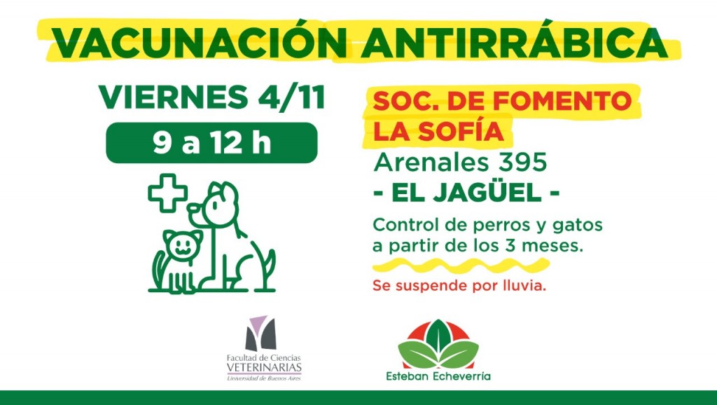 El Municipio de Esteban Echeverría y el equipo de la Facultad de Ciencias Veterinarias de la Universidad Nacional de Buenos Aires realizarán una nueva jornada de control y vacunación antirrábica en la Sociedad de Fomento La Sofía (Arenales 395, El Jagüel)