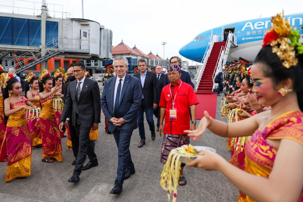 El Presidente arribó al Aeropuerto Internacional de Denpasar-Ngurah Rai de la isla de Bali, Indonesia, para participar de la 17ª Cumbre de Líderes del G20 que se llevará a cabo los días 15 y 16 de noviembre, durante los cuales mantendrá reuniones bilaterales con su par de China, Xi Jinping, y con la directora gerente del FMI, Kristalina Georgieva, entre otras actividades
