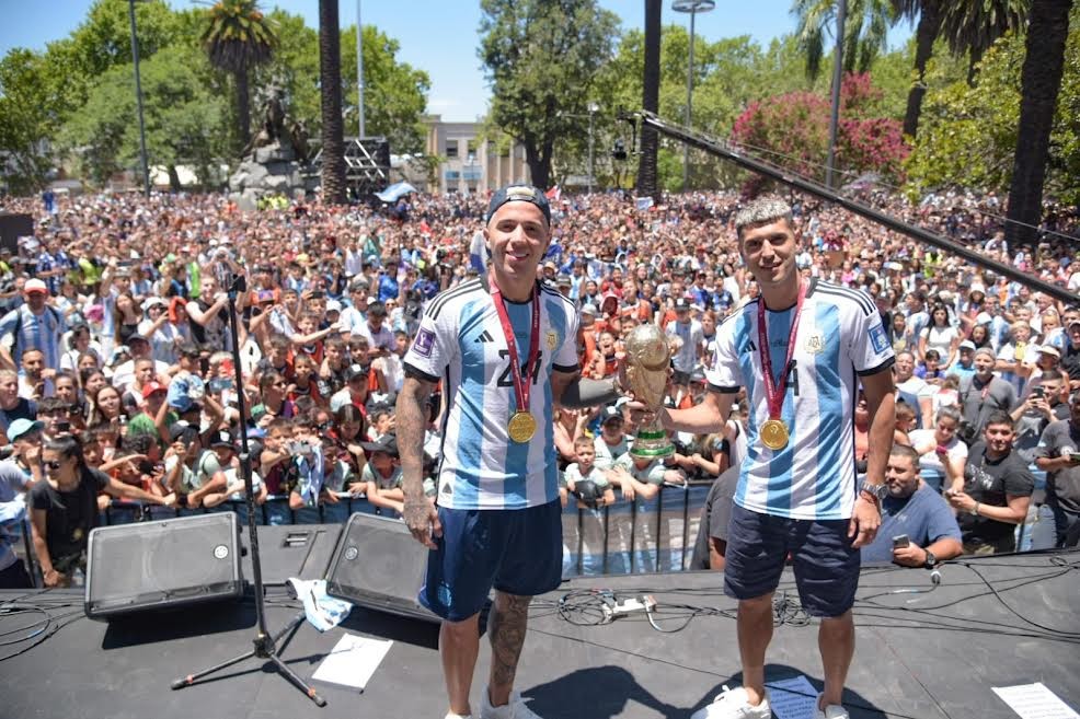 (San Martín, 26.Dic.2022 / A1 Noticias) El intendente de San Martín, Fernando Moreira, junto a más de 20 mil vecinas y vecinos, recibieron en la Plaza Central a Enzo Fernández y Exequiel Palacios, Campeones del Mundo con la Selección Argentina en Qatar 2022 y formados en la ciudad.