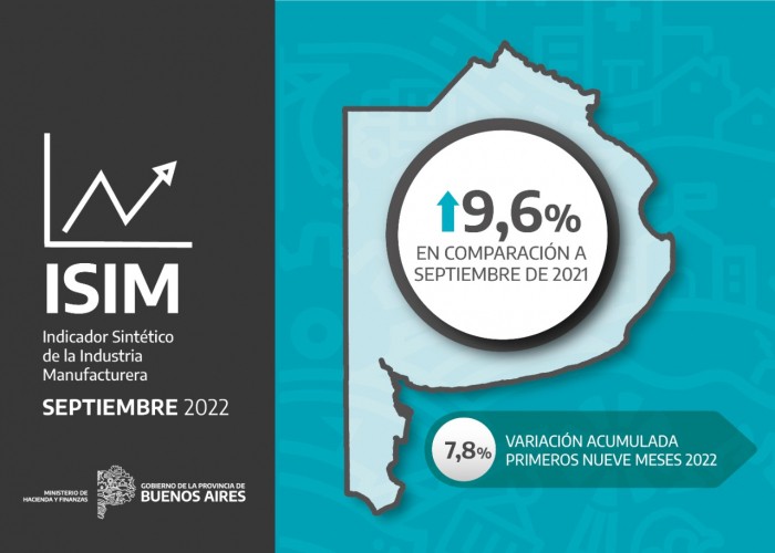 El Indicador Sintético de la Industria Manufacturera (ISIM), elaborado por la Dirección Provincial de Estadística, mostró que en septiembre de 2022 nueve de los once bloques que componen el ISIM-PBA tuvieron aumentos interanuales. Las principales variaciones, por orden de incidencia, fueron: Textiles y cueros (44,9%); Minerales no metálicos (33,3%); Productos químicos (7,9%); Alimentos y bebidas (4,0%); Máquinas y equipos (6,3%); Refinación de petróleo (7,0%); Vehículos automotores (6,9%); Metales comunes (5,9%) y Papel y cartón (5,0%).
