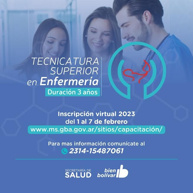 La Secretaría de Salud de la Municipalidad informa que se extiende hasta el martes 7 de febrero la inscripción para la Tecnicatura Superior en Enfermería, que se cursa en el Centro Regional Universitario de Bolívar